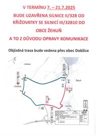 V TERMÍNU 7. – 21.7.2025 BUDE UZAVŘENA SILNICE II/328 OD KŘIŽOVATKY SE SILNICÍ III/32810 DO OBCE ŽEHUŇ A TO Z DŮVODU OPRAVY KOMUNIKACE. Objízdná trasa bude vedena přes obec Dobšice