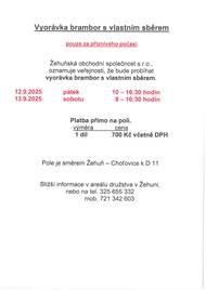 Vyorávka brambor s vlastním sběrem objednaných u ŽOS v Žehuni se uskuteční ve dnech 12.-13.9.2025. Pouze za příznivého počasí. Cena 700 Kč/díl. Platba přímo na poli. Pátek 10 - 16:30 hodin. Sobota 8 - 16:30 hodin. Kontaktní telefon tel. 325 655 332 nebo 721 342 603.