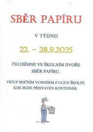 Sběr papíru probíhá na školním dvoře v termínu 22.-28.9.2025 Vstup bočním vchodem z ulice Školní, kde je přistaven kontejner