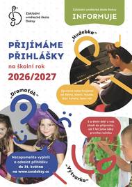 Základní umělecká škola přijímá nové žáky v Doksech i v Dubé. V Doksech škola přijímá žáky do těchto oborů: • Malý umělec – přípravné studium napříč všemi obory pro děti 5–6 let, • hudební obor – přípravné i základní studium, • výtvarný obor – přípravné i základní studium, • literárně-dramatický obor – přípravné i základní studium. V Dubé škola přijímá žáky do těchto oborů: • hudební obor – přípravné a základní studium hry na zobcovou flétnu, klavír, housle nebo zpěv, • výtvarný obor – přípravné a základní studium. Jak se přihlásit: • přihlášku je potřeba odevzdat nebo odeslat do školy do 31. května • po podání přihlášky budou uchazeči pozváni k talentové přijímací zkoušce • na zkoušku není třeba se předem připravovat 👉 Více informací najdete na webu: https://zusdoksy.cz/informace/pro-zajemce/