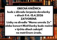 Obecná knižnica bude z dôvodu čerpania dovolenky v dňoch 9.4.-15.4.2026 ZATVORENÁ. Lístky na divadlo “Mama umrela 2x” alebo koncert Mistříňanky bude možné v týchto dňoch zakúpiť na matričnom úrade.