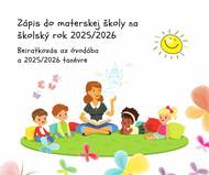 zápis detí do materskej školy na školský rok 2025/2026 sa uskutoční: 5.5.2025 od 11:00 do 16:30 a 6.5.2025 v čase od 11:00 do 16:30