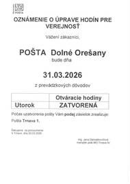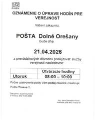 Obecný úrad Dolné Orešany oznamuje občanom, že dňa 04.04.2026, t.j. v sobotu bude zberný dvor zatvorený.