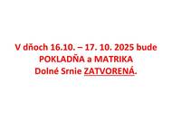 Pokladňa a Matrika Dolné Srnie zatvorená v dňoch 16.10. - 17.10. 2025