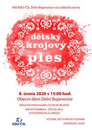 Před 1 měsícemDětský krojový plesMístní organizace KDU-ČSL zve všechny děti a jejich doprovod na Dětský krojový ples, který se uskuteční v neděli 8. února od 15:00 hodin v sále Obecního domu. Hraje DH ZUŠ Velké Bílovice, těšit se můžete na dětský sóla, vystoupení DFS Slunéčko a bohatou tombolu. Vstupné pro děti v krojích zdarma, dospělý doprovod 150 Kč.
