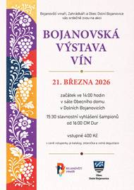 Před 12 dnyVýběr vzorků na Bojanovskou výstavu vínBojanovští vinaři oznamují všem, kdo mají zájem darovat vzorky vína na Bojanovskou výstavu vín, která se bude konat v sobotu 21. 3. 2026 ve 14.00 hod., že sběr vzorků bude na starém sále tento pátek v době od 18:00 – 20:00, v sobotu od 18:00 – 20:00 a v neděli od 9:00 – 11:00. Láhve, uzávěry a popisovací štítky si můžete vyzvednout ve vinařských potřebách Hromek a to každý den v rámci jejich otevírací doby nebo na starém sále v době výběru vzorků. Letos můžete po jedné láhvi darovat i vína do nebodované sekce, jako jsou autentická, archivní a jinak speciální vína. Za vaše vína předem děkujeme.