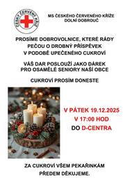 MS ČČK prosí všechny dobrovolnice, které rády pečou, o drobný příspěvek upečeného cukroví. Váš dar poslouží jako dárek pro seniory naší obce. Cukroví prosím doneste v pátek 19.12.2025 v 17 hod do D-centra. Za příspěvek předem děkujeme.