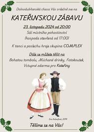 Dolnodubňanská chasa Vás zve na KATEŘINSKOU ZÁBAVU, která proběhne 23. 11. 2024 od 20:00 ve společenském sále, hraje skupina COMPLEX. Vstupné: 150,- Kč, hospoda otevřena od 17:00 hod.