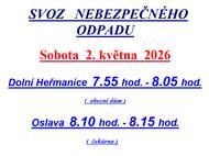Dobrý den, Oznamujeme, že dne: 02.05.2026 proběhne v obci Dolní Heřmanice Svoz nebezpečného odpadu Kdy: Sobota 02.05.2026 Kde: Dolní Heřmanice (obecní dům) 07:55 - 08:05 Kde: Oslava (čekárna) 08:10 - 08:15 Děkujeme. Obec Dolní Heřmanice