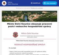 Město Dolní Kounice hledá pracovníka údržby města. Více informací na tel.: 734 604 268; 513 030 411 nebo e-mailu info@dolnikounice.cz Pokračuje adventní sbírka určená na provoz, údržbu a rekonstrukci kostela sv. Petra a Pavla. Přispět můžete do pokladniček v Květinovém atelieru Daniely Žďárské, A.T.G. Centru, AZ Marketu nebo v rámci adventního koncertu. Už tuto sobotu dorazí do Dolních Kounic Mikuláš se svojí známou družinou. Sejdeme se 6. 12. 2025 v 16.00 hodin v kulturním domě. Program v kulturním domě potrvá přibližně 1 hodinu. Poté společně vyrazíme na procházku ke zvoničce na náměstí Míru. Veřejné zasedání Zastupitelstva města Dolní Kounice proběhne 17. 12. 2025 v 18.00 hod. v kulturním domě. Myslivecké sdružení Rosa Coeli oznamuje, že ve dne 30. 12. 2025 proběhne hon na drobnou zvěř od 8.00 do 16.00 hod. v katastru města Dolní Kounice, konkrétně v oblasti Šibeničné, Opatova, Karlova, Strání a Kamenného vrchu. Dovolujeme si vás informovat, že v úterý 30. 12. 2025 proběhne mimořádný svoz papíru a plastu. Tento svoz umožní odložit větší množství odpadu před koncem roku. Pošta Dolní Kounice bude dne 31. 12. 2025 otevřena pouze 10.00-12.00 hod. Dále ve dnech 24., 25., 26. 12. 2025 a 1. 1. 2026 bude pobočka zcela uzavřena. Městský úřad Dolní Kounice bude v době vánočních svátků a koncem roku 2025 otevřen v pondělí 22. 12. 2025, v pondělí 29. 12. 2025 a v pátek 2. 1. 2026.