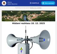 Hlášení rozhlasu 21. 8. 2025 Od 28. 7. 2025je z důvodu stavebních prací na opěrné zdi a kanalizaci uzavřen úsek silnice směrem na Ivančice, konkrétně od oblasti kamenolomu až po most v Moravských Bránicích. Po dobu uzavírky jsou zajištěny objízdné trasy, které jsou řádně označeny dopravním značením a k dispozici na webových stránkách města. Přístup k nemovitostem, vjezd na čerpací stanici, do autoservisu a do kamenolomu dle aktuální situace stavby. Autobusové zastávky jsou na ul. Ivančická bez obsluhy. Uzavírka železničního přejezdu na silnici Silůvky – Moravské Bránicev termínu 11.-29. 8. 2025. Od března 2025 pokračuje rekonstrukce ul. Smetanova. Dbejte prosím dopravního značení a osobní bezpečnosti. V období od 1. 6. do 31. 8. 2025 probíhá obnova nízkého napětí v ulici U Sboru. Z důvodu výkopových prací je na dobu nezbytně nutnou částečně omezen přístup ke škole a na pozemky majitelů v této lokalitě. Zahájení školního roku ZŠ a MŠ Dolní Kounice 1. 9. 2025 v 8.05 hod. v obou budovách. MUDr. Košťálová – dovolená 1.-12. 9. 2025 V neděli 24. 8. 2025 od 13.00 hod. proběhnou Kounice v pohybu – rozloučení s prázdninami. Začátek trasy u fotbalového hřiště. Děti se mohou těšit na pěnovou party, skákací hrad a nafukovací skluzavku. Od 10.00 hod. bude na Hradu a zámku probíhat samostatná stezka s úkoly pro děti. Historické slavnosti Rosa coeli 2025 proběhnou v sobotu 6. 9. 2025 od 12.00 hod.