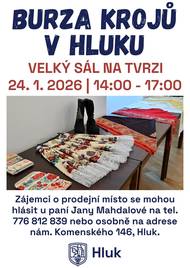 Dne 24. ledna od 14 do 17 hodin se ve městě Hluk – ve velkém sále na tvrzi – uskuteční burza krojů. Máte doma kroj, jeho součásti nebo krojové doplňky, které již nevyužijete, nebo naopak něco sháníte? V případě zájmu o prodejní místo či pro více informací kontaktujte paní Janu Mahdalovou na telefonním čísle 776 812 839.