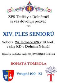 ŽPS Tetičky z Dolněmčí Vás zve na Ples seniorů, který se bude konat v sobotu 24. ledna v 19 hodin v KD v Dolním Němčí. K tanci a poslechu hraje DH Javorinka. Vstupné 100,- Kč. Bohatá tombola a občerstvení zajištěny.