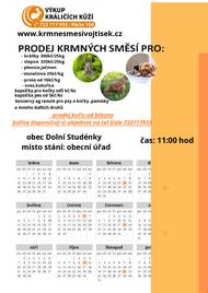 Firma Vojtíšek bude tuto sobotu 14.3.2026 od 11:00 hod. u Obecního úřadu v Dolních Studénkách prodávat krmné směsi pro hospodářská i domácí zvířata. V nabídce bude: nosné kuřice 19. týdnů cena 280 Kč/ks, kuřice doporučuji rezervovat na tel.čísle 722 717 935 obilí, letní směs pro slepice 25 kg / 330 Kč granule pro králíky 25 kg / 300 Kč kapsičky pro kočky a psy 5 Kč/ks Jako obvykle budu také vykupovat králičí kůže cena 15 Kč/ks