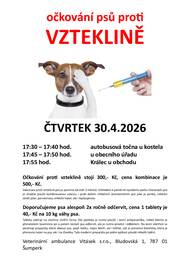 Veterinární ambulance Vitásek ze Šumperka nabízí očkování psů proti vzteklině ve čtvrtek dne 30.4.2026 v Dolních Studuénkách.