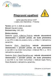 Vážení občané, chtěli bychom Vás touto cestoujménem KIDSOKu informovat o plánované úplné uzavírce silnice II/437 Staměřice – Skoky – Trnávka při akci „II/437 Lipník nad Bečvou – Přáslavice (II. etapa)“, v termínu od 8. 4. 2026 do 31. 10. 2026. Uzavřeným úsekem jsou vedeny linky VLD v závazku Olomouckého kraje 891345, 891349, 920516, 920520 a 920521 dopravce ARRIVA autobusy a. s. a linka 890345 dopravce VOJTILA TRANS s.r.o. Pro linky VLD bude platná úplná uzavírka v termínu od 13. 4. 2026 do 31. 10. 2026. Návrh řešení dopravní obslužnosti po dobu trvání uzavírky: Uvedenými úseky nebude umožněn průjezd spojům dotčených linek, které budou vedeny po následujících objízdných trasách: Linka 890345 Spoj 43 – bude ukončen v zastávce Lipník n.Bečvou,,aut.st. Na něj bude navazovat spoj spoj 143 směr Hranice. Spoj 120 – na spoj bude v zastávce Lipník n.Bečvou,,aut.st. navazovat spoj 20 směr Olomouc. Zastávka Dolní Újezd,Staměřice,rest. nebude obsluhována bez náhrady. Zastávka Dolní Újezd,Skoky nebude obsluhována bez náhrady. Zastávka Dolní Újezd,Staměřice,Mokř nebude obsluhována bez náhrady. Zastávka Lipník n.Bečvou,Trnávka nebude obsloužena bez náhrady. Kyvadlový provoz minibusu v úseku Staměřice – Skoky – Dolní Újezd Kyvadlové spoje budou obousměrně vedeny z/do zastávky Dolní Újezd,,kostel Kyvadlové spoje budou sloužit k návozu/odvozu cestujících na spoje linek VLD 345, 516 a 519. U vybraných spojů jsou v JŘ uvedeny informace o navazujících spojích směr Olomouc nebo Lipník n. Bečvou a Hranice. Kyvadlové spoje budou provozovány pouze v pracovní dny. Vybrané spoje budou vedeny v jiných úsecích Spoj 413 – Dolní Újezd,,kostel – Lipník n.Bečvou,Trnávka – Lipník n.Bečvou,,Jiráskova – Lipník n.Bečvou,,aut.st. Spoj 412 – Lipník n.Bečvou,,aut.st. – Lipník n.Bečvou,Trnávka – Dolní Újezd,,kostel Spoj 135 – Dolní Újezd,Staměřice,,rest. – Dolní Újezd,Skoky – Dolní Újezd,,kostel – Lipník n.Bečvou,Trnávka – Lipník n.Bečvou,,žel.st. – Lipník n.Bečvou,,aut.st. Spoj 130 – Lipník n.Bečvou,,aut.st. – Lipník n.Bečvou,Trnávka – Dolní Újezd,,kostel – Dolní Újezd,Skoky – Újezd,Staměřice,,rest. – Velký Újezd,,aut.st. Spoj 435 – Velký Újezd,,aut.st. – Dolní Újezd,Staměřice,,rest. – Dolní Újezd,Skoky – Dolní Újezd,,kostel Zastávka Dolní Újezd,Staměřice,rest. nebude obsluhována v původní poloze, ale bude přemístěna ke kapli Panny Marie Bolestné k náhradnímu označníku. Zastávka Dolní Újezd,Skoky nebude obsluhována v původní poloze, ale bude obousměrně přemístěna na MK v blízkosti č.p. 133 k náhradním označníkům. Zastávka Dolní Újezd,Staměřice,Mokř nebude obsluhována bez náhrady. Linka 891345 Vybrané spoje, které jsou vedeny v úseku Olomouc - Hranice a opačně byly rozděleny v Lipníku n. Bečvou stejně jako u linky 890345. Spoj 7 – bude ukončen v zastávce Lipník n. Bečvou z důvodů dodržení jízdních dob řidiče (BP). Na tento spoj bude vyčkávat spoj 125 (navazující na spoj 25) ve stejné zastávce a bude pokračovat směrem do zastávky Hranice,,aut.st. V dopoledních hodinách dojde k omezení přepravní kapacity spojů v úseku mezi zastávkami Hranice,,aut.st. a Velký Újezd,,aut.st. a to z důvodů dodržení BP řidičů. Pro cestující z obcí Staměřice a Skoky bude docházet k přestupním vazbám v zastávce Dolní Újezd,,kostel. Ve večerních hodinách bude spoj 30 nahrazen v úseku mezi zastávkami Lipník n. Bečvou,,aut.st. a Velký Újezd,,aut.st. vozidlem kyvadlového provozu „MINIBUS“. Dojde k výraznějšímu posunu odjezdového času z výchozí zastávky a spoj bude veden přes Trnávku – Dolní Újezd – Skoky – Staměřice. V zastávce Velký Újezd,,aut.st. na něj bude čekat spoj 30 směr Olomouc. Zastávka Dolní Újezd,Staměřice,rest. nebude obsluhována bez náhrady. Zastávka Dolní Újezd,Skoky n