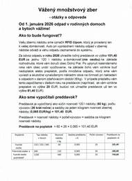 V prílohe Vám prikladáme otázky a odpovede k váženému množstvovému zberu od 01.01.2026. Oznam vysvetľuje ako to bude fungovať, koľko bude preddavok a všetky dôležité veci ohľadne tohto zberu.