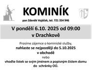 V pondělí 6.října od 9 do 15 hod. bude v obci kominík.