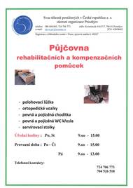 Svaz tělesně postižených v České republice nabízí k zapůjčení polohovací lůžka, ortopedické vozíky, pevná a pojízdná chodítka a další kompenzační pomůcky ve své půjčovně v Prostějově. Kontakt: 724706773 nebo 704526518