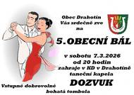 Přijďte se pobavit na 5. obecní bál, který se koná v sobotu 7. března 2026 od 20 hodin. Akce proběhne v kulturním domě v Drahotíně, kde zahraje taneční kapela Dozvuk. Vstupné je dobrovolné, a pro všechny návštěvníky bude připravena bohatá tombola.