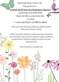 Milí rodičia, srdečne Vás pozývame na zápis detí do našej materskej školy na školský rok 2026/2027, ktorý sa uskutoční dňa 05.05.2026 v čase od 08:00 do 16:10 hod. Tešíme sa na Vás.