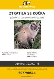 Jočinka je 13 let stará kočka. Nemá obojek ani čip. Je kastrovaná a váží cca 2,5 kg. Kočka je drobného vzrůstu, bez pravého očička. Slyší na volání "Joči". Naposledy viděna dne 3.9.2025 dopoledne.