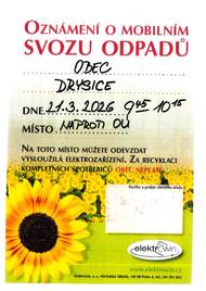 V sobotu 21.3.2026 v době od 9:45 - 10:15 bude před OÚ Drysice prováděn sběr a odvoz nebezpečného odpadu a elektrozařízení. Informaci o tomtp sběru jsme obderželi až v této době, proto se omlouváme za pozdní informaci.