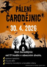 Pálení čarodějnic proběhne 30. 4. 2026 v obecním dvoře. Začátek v 17 hodin. Pro děti budou připraveny čarodějné hry. Občerstvení si každý přinese sám. Kostýmy čarodějnic a čarodějů jsou vítány. Letu zdar!