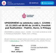 UPOZORNĚNÍ na odstávku vody č. 121906 - 15.12.2025 od 08:00 do 14:00 h, Frenštát pod Radhoštěm - Podříčí, Horní, U Příkopy Aktuální informace o zahájení opravy poruchy a přerušení dodávky vody lze získat na www.smvak.cz v sekci Přerušení dodávky vody, podsekci Poruchy Číslo poruchy: 121906 Obec: Frenštát pod Radhoštěm Ulice: Podříčí Skut. zahájení: Plán. zahájení orientačně: 15.12.2025 08:00 Plán. ukončení orientačně: 15.12.2025 14:00 Dotčená oblast: Podříčí, Horní, U Příkopy Způsob náhradního zásobování: Umožněno předzásobení