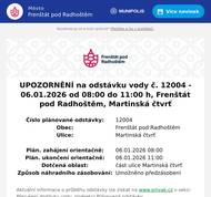 Číslo plánované odstávky: 12004 Obec: Frenštát pod Radhoštěm Ulice: Martinská čtvrť Plán. zahájení orientačně: 06.01.2026 08:00 Plán. ukončení orientačně: 06.01.2026 11:00 Dotčená oblast: část ulice Martinská čtvrť Způsob náhradního zásobování: Umožněno předzásobení Aktuální informace o průběhu odstávky lze získat na www.smvak.cz v sekci Přerušení dodávky vody, podsekci Plánované odstávky