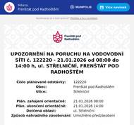 Číslo plánované odstávky: 122220 Obec: Frenštát pod Radhoštěm Ulice: Střelniční Plán. zahájení orientačně: 21.01.2026 08:00 Plán. ukončení orientačně: 21.01.2026 14:00 Dotčená oblast: ul. Střelniční Způsob náhradního zásobování: Umožněno předzásobení Atuální informace o zahájení opravy poruchy a přerušení dodávky vody lze získat na www.smvak.cz v sekci Přerušení dodávky vody, podsekci Poruchy. V případě potřeby kontaktujte Poruchovou službu 800 292 300 (24 hodin denně) nebo Call centrum 800 292 400 (7:30-18:00)