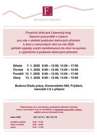 Finanční úřad pro Liberecký kraj, Územní pracoviště v Liberci pro vás v období podávání daňových přiznání k dani z nemovitých věcí na rok 2026 pořádá výjezdy svých zaměstnanců do obcí na pomoc s vyplněním a podáním daňových přiznání. Středa 7. 1. 2026 8:00 – 12:00, 13:00 – 17:00 Čtvrtek 8. 1. 2026 8:00 – 12:00, 13:00 – 15:00 Pondělí 12. 1. 2026 8:00 – 12:00, 13:00 – 17:00 Úterý 13. 1. 2026 8:00 – 12:00, 13:00 – 15:00 Budova Úřadu práce, Komenského 680, Frýdlant, kancelář č.6 v přízemí. Připomínáme, že v souvislosti s podáváním daňových přiznání k dani z nemovitých věcí na rok 2026 je na Územním pracovišti v Liberci zajištěn provoz informační linky. leden 2026: 953 132 311, 983 132 310 pondělí a středa: 8:00 - 17:00 úterý a čtvrtek: 8:00 - 14:00 pátek: 8:00 – 12:00