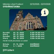 Městský úřad Frýdlant bude ve vybraných dnech na konci roku 2025 a na začátku roku 2026 fungovat v upraveném provozním režimu. Prosíme občany, aby věnovali pozornost uvedené otevírací době. Pondělí 22. 12. 2025 🕗 8.00–14.00 hod. Úterý 23. 12. 2025 🕗 8.00–14.00 hod. Pondělí 29. 12. 2025 🕗 8.00–14.00 hod. Úterý 30. 12. 2025 🕗 8.00–14.00 hod. (12.00–12.30 přestávka na oběd) Středa 31. 12. 2025 Všechna pracoviště Městského úřadu Frýdlant budou uzavřena! Pátek 2. 1. 2026 Všechna pracoviště Městského úřadu Frýdlant budou uzavřena! Děkujeme za pochopení. 🙏