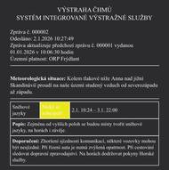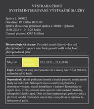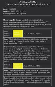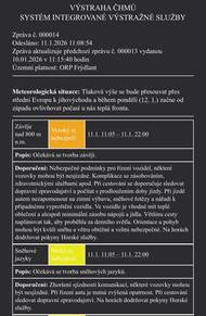 Výstraha ČHMÚ 📍 Územní platnost: ORP Frýdlant 🕒 Platnost: 2. 1. 2026 od 10:24 do 3. 1. 2026 do 22:00 ⚠️ Stupeň nebezpečí: nízký ❄️ Popis situace: Zejména ve vyšších polohách se budou místy tvořit sněhové jazyky, na horách i závěje. 🚗 Doporučení: očekávejte zhoršenou sjízdnost komunikací, některé úseky mohou být dočasně nesjízdné, při řízení dbejte zvýšené opatrnosti, sledujte aktuální dopravní zpravodajství, na horách dodržujte pokyny Horské služby. Prosíme o zvýšenou opatrnost!