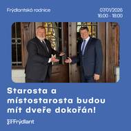 Ve středu 7. ledna, tedy opět první středu v měsíci, budou mít starosta a místostarosta Frýdlantu pro všechny zájemce 🕔 od 16.00 do 18.00 hodin dveře dokořán. Dveře dokořán jsou pravidelnou akcí, během níž mohou občané přijít za vedením města do jejich kanceláří 📍v prvním patře radnice s nápady 💡, podněty ke zlepšení života ve Frýdlantu nebo s problémy, s jejichž řešením jim mohou pomoci starosta Dan Ramzer či místostarosta Jiří Stodůlka. Přijít ve vymezený čas může kdokoli bez objednání.