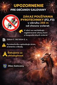 ???? UPOZORNENIE PRE OBČANOV OBCE GALOVANY Vážení spoluobčania, dovoľujeme si vás upozorniť, že v katastrálnom území obce Galovany sa nachádzajú registrované chovy koní a hospodárskych zvierat, evidované v súlade s platnými právnymi predpismi SR. ⚠️ Používanie zábavnej pyrotechniky kategórií F2 a F3