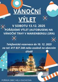 Haj u Duchcova: SMS: SO: 13.12. 2025 poradame VYLET (autobusem) na VANOCNI TRHY v Marienbergu (SRN). Telefonicka rezervace do 10. 12. 2023 na tel: 417 837 248 nebo osobne