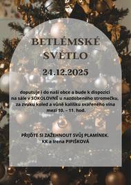 Haj u Duchcova: BETLEMSKE SVETLO: 24.12. doputuje i do nasi obce a bude k dispozici na sale v SOKOLOVNE u nazdobeneho stromecku, za zvuku koled a vune kalisku svareneho vina mezi 10. - 11. hod. PRIJDTE SI ZAZEHNOUT SVUJ PLAMINEK. KK a Irena PIPISKOVA
