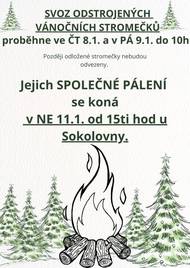 SVOZ odstrojených vánočních stromečků proběhne ve ČT 8.1. a v PÁ 9.1. do 10 h. Později odložené stromečky nebudou odvezeny. Jejich SPOLEČNÉ PÁLENÍ se koná v NE 11.1. od 15ti hod u Sokolovny.
