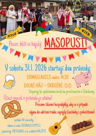 Pozor, blíží se hájský MASOPUST! V sobotu 31.1. 2026 startují dva průvody: DOMASLAVICE náves: 14.30 DOLNÍ HÁJ – OKRUŽNÍ: 15.15 Doputují ke společnému veselí na prostranství u Sokolovny.