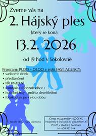 Zveme vás na 2. HÁJSKÝ PLES, který se koná 13.2. 2026 od 19 hod v Sokolovně. VSTUPENKY V PRODEJI OD STŘEDY 14.1. 2026 na podatelně Obecního úřadu PO-PÁ v úředních hodinách tel: 603 933 344 VSTUPENKY JE MOŽNÉ PLATIT POUZE V HOTOVOSTI!!