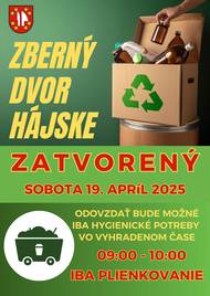 Zberný dvor v Hájskom bude v sobotu 19. apríla 2025 ZATVORENÝ. Odovzdat bude možné iba hygienické potreby v čase od 09:00 do 10:00 - IBA PLIENKOVANIE! Za pochopenie ďakujeme.