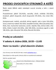 V sobotu 4. dubna 2026, v čase 10:55 – 11:05 v Hamru na Jezeře – před obecním úřadem si můžete zakoupit ovocné stromky a keře z vlastní produkce Školního statku Středočeského kraje - středisko Mělník. Nenechtě si tuto příležitost ujít!. Vice info v letáčku nebo na stránkách obce.