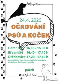 V pátek 24.4.2026 se uskuteční pravidelné očkování psů a koček. Harmonogram: Hamr na Jezeře (u úřadu) 16:00 - 16:30 Břevniště (u otočky autobusu) 16:40 - 17:10 Útěchovice (u kapličky) 17:20 - 17:40