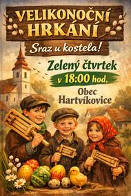 Před 20 dnyHlášení 2.4.2026Obec Hartvíkovice zve malé i velké na velikonoční hrkání. Sejdeme se na zelený čtvrtek v 18.00 hodin u kostela. Těšíme se na vás. Oznamujeme občanům, že v sobotu 4. 4. 2026 je sběrný dvůr ve Studenci uzavřen.