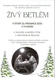 Divadelní spolek JenTak a sbor Vitus Havlíčkova Borová vás všechny srdečně zvou na ŽIVÝ BETLÉM, v úterý 23. prosince 2025 v 17 hodin v kostele svatého Víta v Havlíčkově Borové.