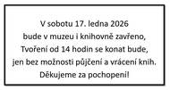 V sobotu 17. ledna bude v muzeu a knihovně zavřeno. Tvoření od 14 hodin se konat bude, ale bez možnosti knížky vracet nebo půjčovat. Děkujeme za pochopení.