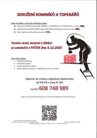 Sdružení kominíků a topenářů bude provádět v naší obci v PÁTEK dne 5. 12. 2025 požadované kontroly a čištění komínů dle zákonu č. 34/2016 Sb. za následující ceny: - Čištění komínů: 550 Kč - Čištění plynových kotlů: 550 Kč - Revize kotlů na tuhá paliva: 1.300 Kč Dále nabízí levné vložkování a frézování komínů, výchozí - kolaudační revize. Zájemci se mohou objednat telefonicky na telefonním čísle: 608 748 989.