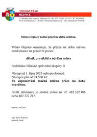 Město Hejnice přijme zaměstnance na pracovní pozici dělník pro úklid a údržbu města na dobu určitou. Podmínka: řidičské oprávnění skupiny B. Nástup: od 1. října 2025 nebo dle dohody. Nástupní plat: od 24.500 Kč. Po zapracování je možná změna pracovního poměru na dobu neurčitou. Bližší informace získáte na telefonních číslech 482 322 106 nebo 482 322 215.