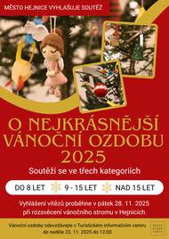 Stejně jako každý rok, i letos vyhlašujeme soutěž o nejkrásnější vánoční ozdobu Soutěžíme ve třech kategoriích a zapojit se tedy může každý! Ozdoby odevzdávejte v Turistické informační centrum Hejnice nebo na Městském úřadě v Hejnicích nejpozději do neděle 23. listopadu do 12 hodin. Vyhlášení proběhne 28. listopadu při Rozsvěcení vánočního stromu.
